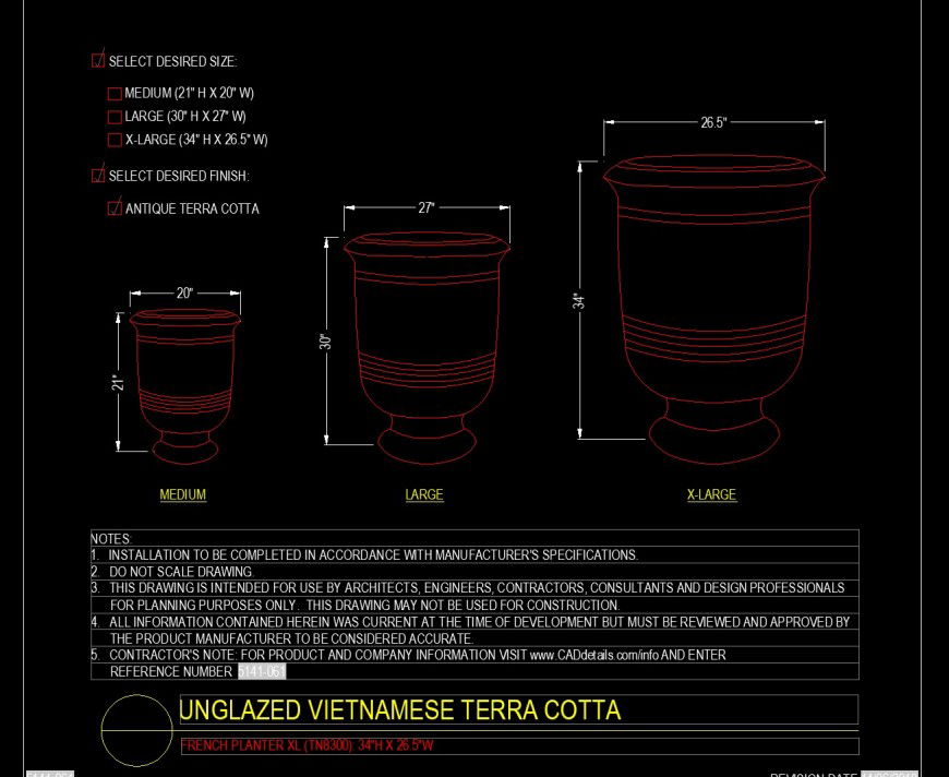 French planter drawing in dwg file. detail drawing of French planter, medium, large and x-large pots, front elevation details, sizes, and other description details.