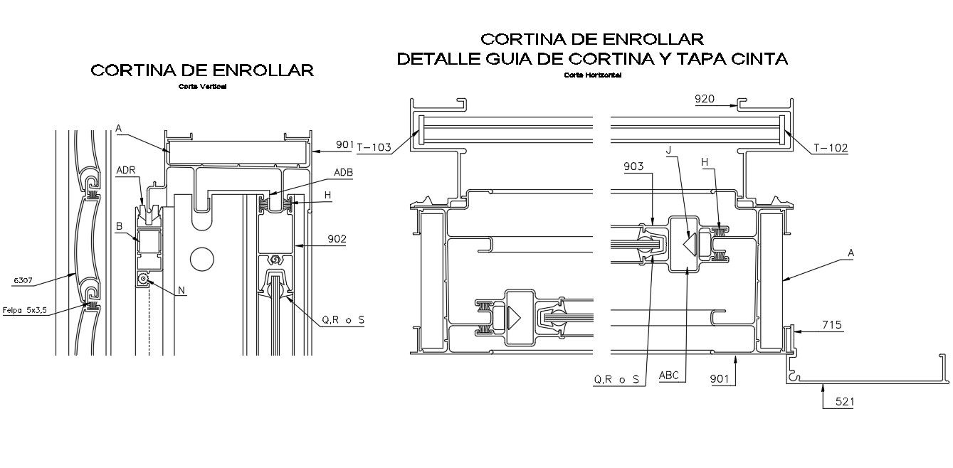 Rolling Curtain Detail Guide And Cover Tape Horizontal Court. Vertycle Cut, All section Detail With dimension.