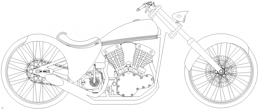 The bike plan detail dwg file. The side elevation of a bike with detailing of seat, wheels, motor, handles, etc.,