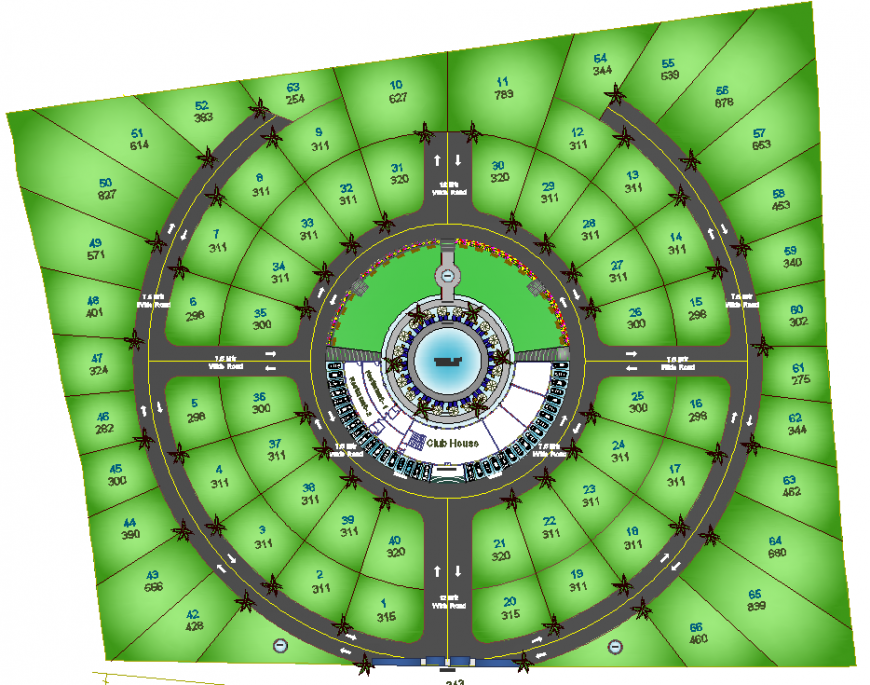 Club house plan detail dwg file. The top view park plan with detailing of plants, trees, shed, walking space, club house, etc.,