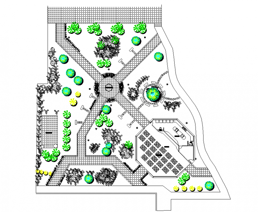 The park plan detail dwg file. The top view park plan with detailing of plants, trees, shed, walking space, etc.,