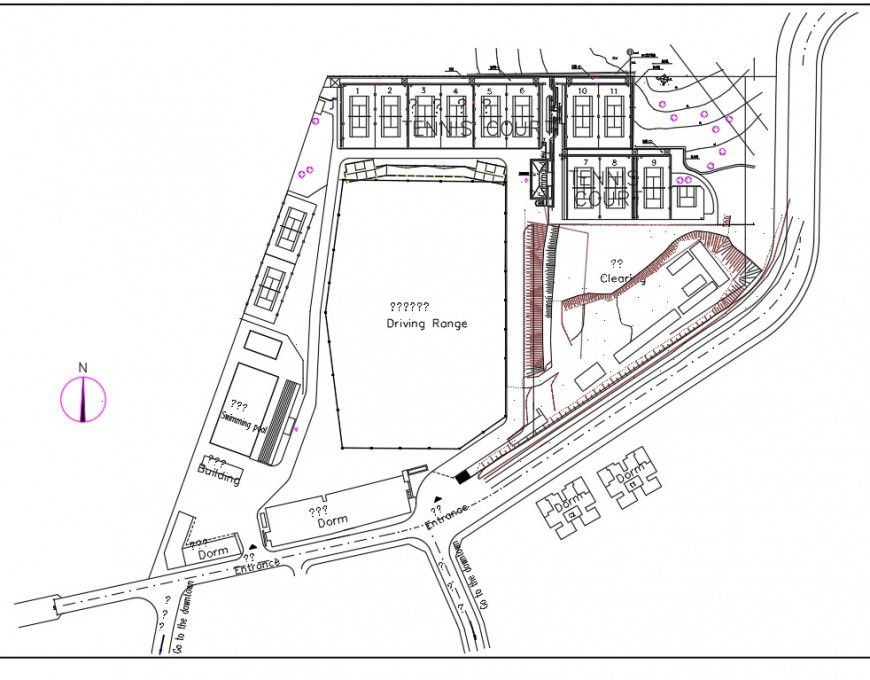 Driving cinema layout line plan detail, north direction detail, hidden lien detail, road detail, top elevation detail parking detail, road marking detail, building detail, ground detail, entry and exit detail, etc.