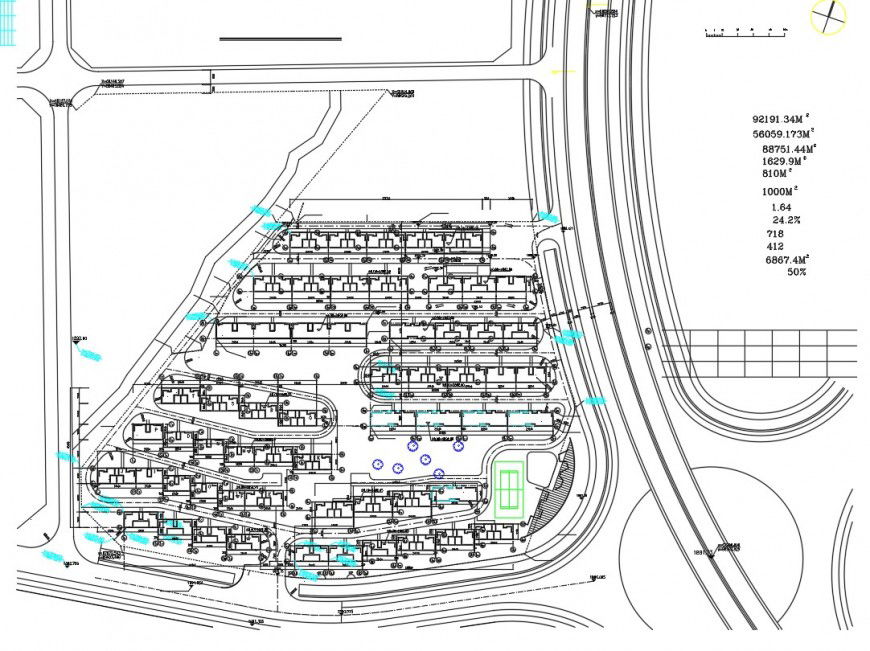 Residential area developer plan layout file, leveling detail, north direction detail, centre line plan detail, dimension detail, naming detail, road detail, hatching detail, landscaping detail in plant and tree detail, hidden lien detail, section lien detail, etc.