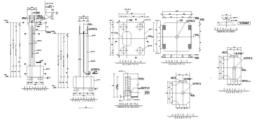 Structure detail view in dwg file. Structure detail view with specification detail, dimensions detail, reinforcement detail, steel bars size detail, section plan detail view etc.