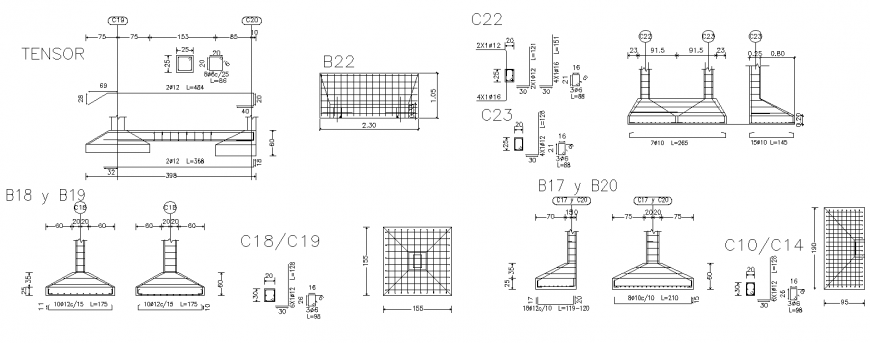 Foundation details in dwg file. detail drawing of of foundation in plan , section and elevation details, reinforcement detail with diameter and dimensions.