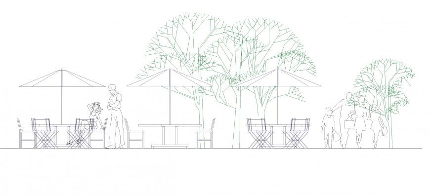 Garden restaurant front view detail, umbrella for shade detail, landscaping detail in tree and plant detail, people detail in girls and mans detail, furniture detail in table and chair detail, etc.