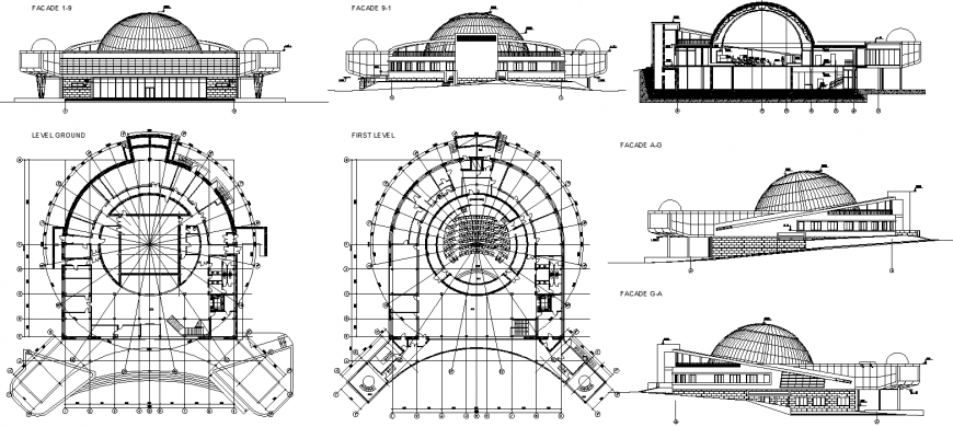The architectural plan detail dwg file. The doom shaped architectural plan with detailing of dimensions, etc., The elevation plan detailing with detailing of dimensions, etc.,