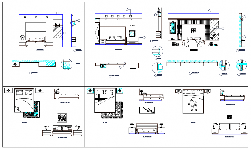 Master Bed Room Interior Furniture Detail & Elevation, plan, Section detail, Bed, TV Unit Table, Side table etcdetail mansion.