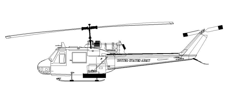 Helicopter Block Detail in drawing, Helicopter type of the Rotor craft & Trust are supplied rotors.Side view mansion the drawing.