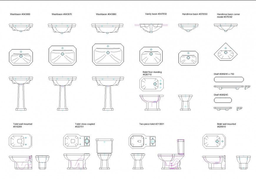 Duravit 1930 series plan layout file, wash basin detail, toilet mounted detail, toilet close-coupled detail, two-piece toiled detail, bidet wall mounted detail, hand rinse basin detail, vanity basin detail, shelf basin detail, main hole detail, etc.