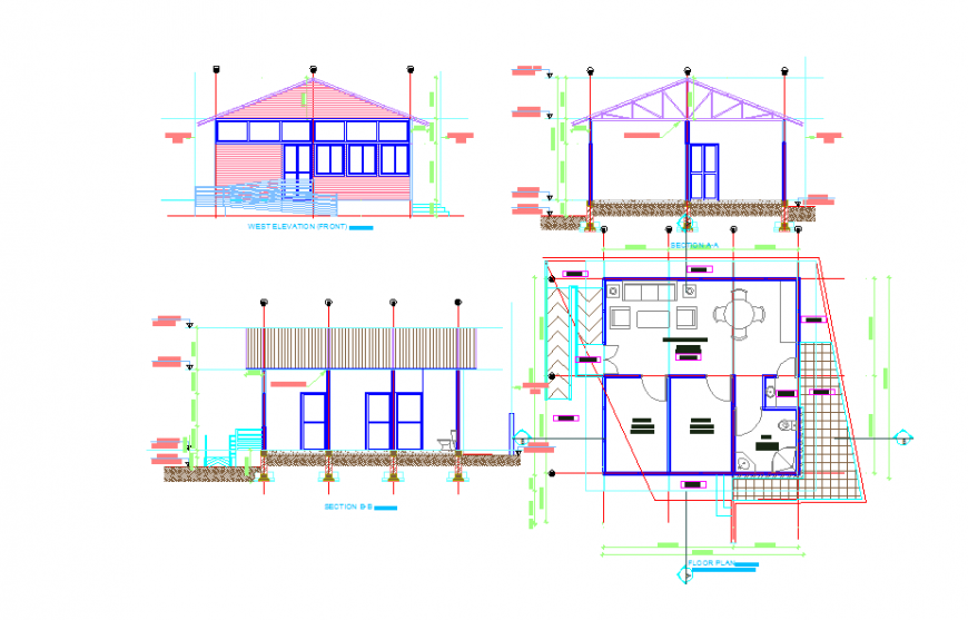 Single Family House Project detail in DWG file, west elevation (front), section a-a, section b-b , FLOOR PLAN, living+kitchen+dining, bedroom, roof plan etc.