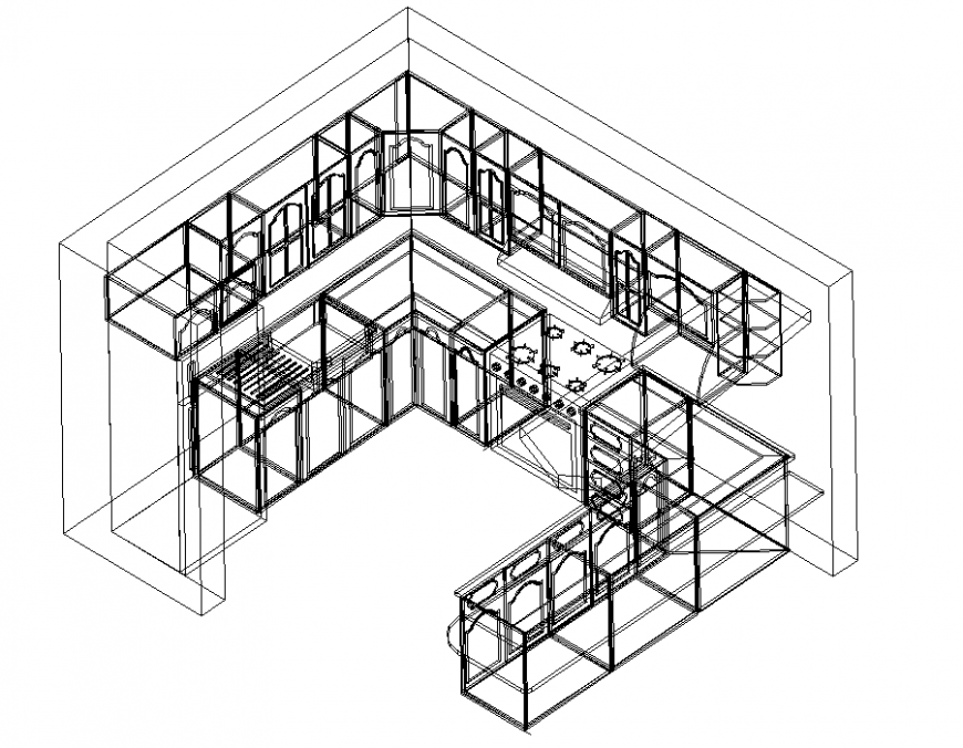 Kitchen plan detail dwg file. The isometric view plan with detailing of kitchen cabinets, stove, lower storage, upper storages, drawers, etc.,