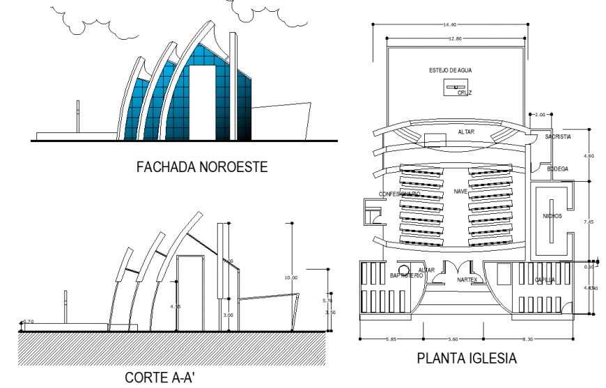 The church plan detail dwg file. The church plan with detailing of water stein, altar, nave, nartex, bodega, niches, etc., The elevation of a front view plan with detailing of façade, textures, sections, etc.,