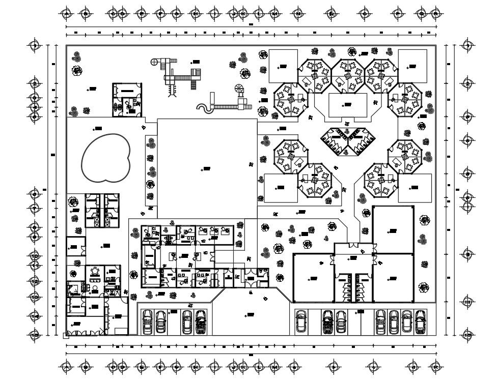 Office CAD Drawing DWG File; 2d CAD drawing of office top view plan includes garden, restaurant, sport area, and water flow with all furniture detail. download free DWG file-office floor plan.