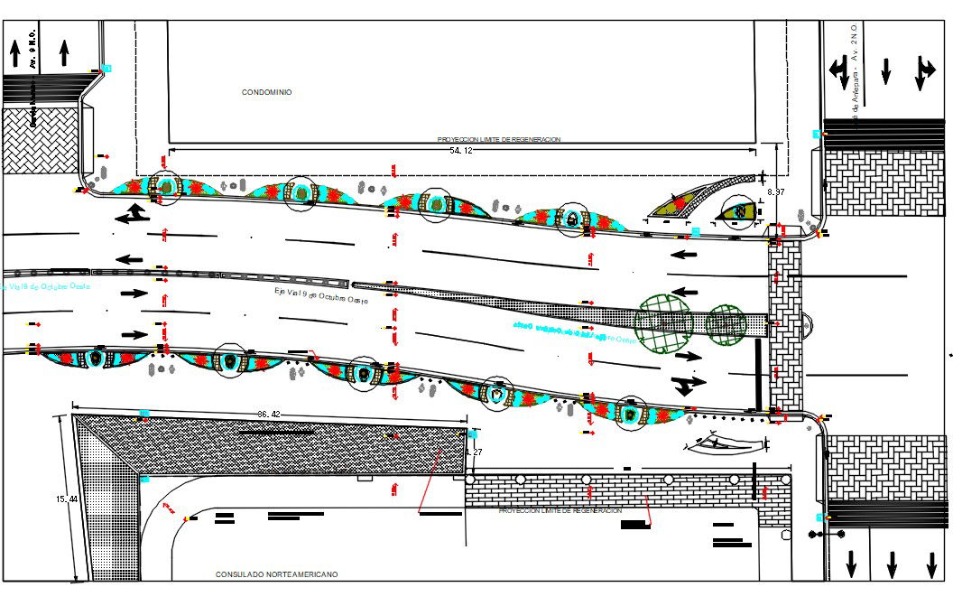 Road Infrastructure CAD Drawing; 2d CAD drawing of road infrastructure design top view with landscaping design and street light in AutoCAD format.