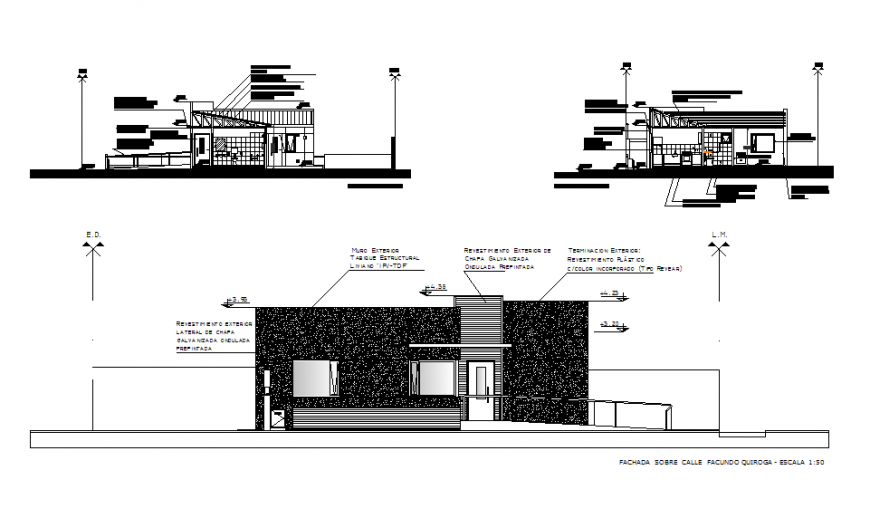 Living place Elevation detail Download file, structural partition lightweight "ipv-tdf", Exterior cladding Galvanized sheet Wavy Pre-painted, Exterior Termination: Plastic coating c / built-in color (Reverse Type), Pergola in accesses w / wooden structure and edge board s / P.E.T. etc detail.