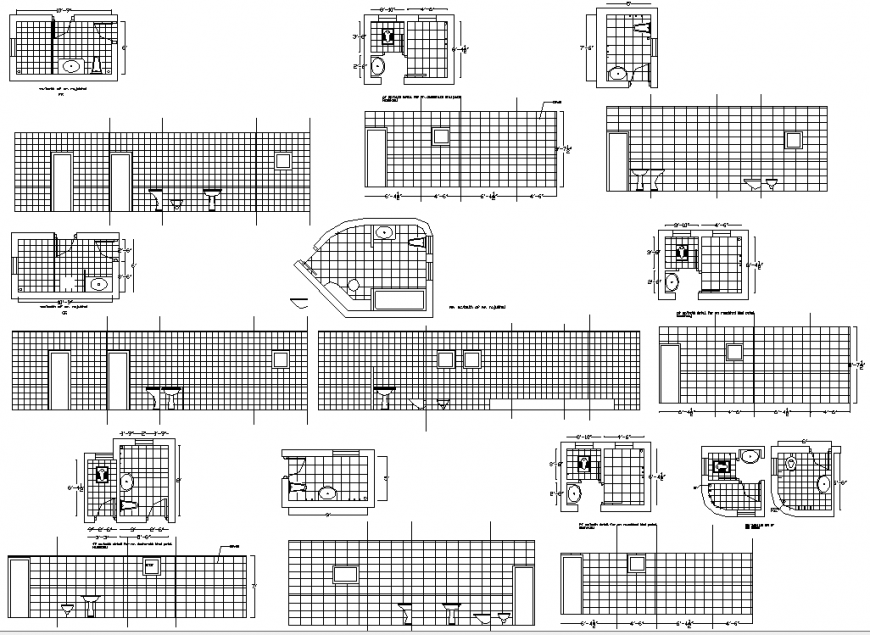 Bathroom plan detail dwg file. The top view plan with detailing of commode, wash-basin, flooring, door, window, dimensions, etc., The elevation plan of bathroom with detailing of wall tiles, elevation of commode, wash basin, etc., with dimension detailing.