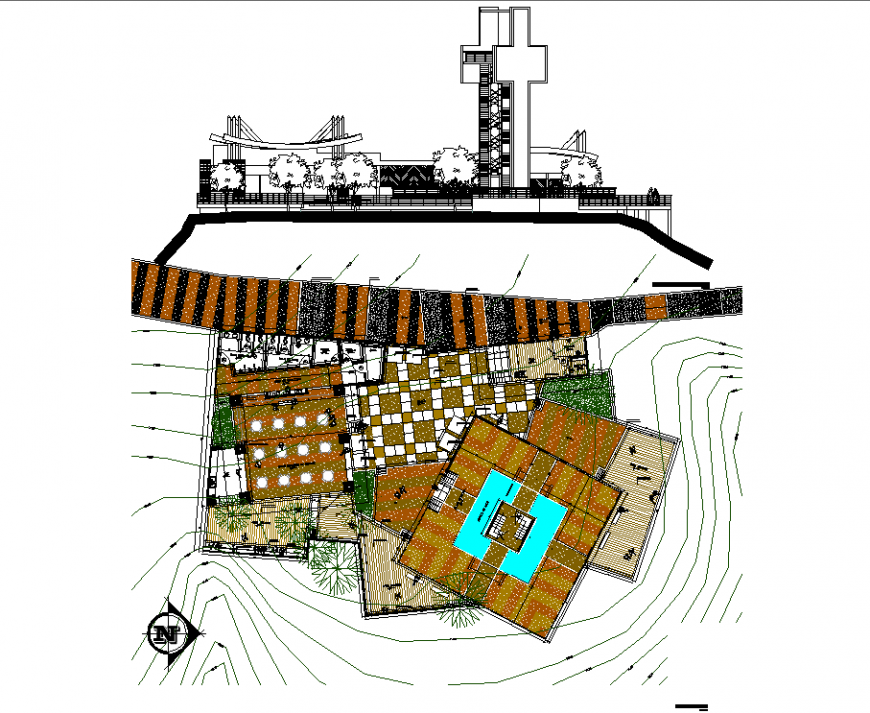 Hotel plan detail dwg file. The top view plan and elevation plan of a hotel with detailing. The detailing of floors, landscaping, yard, garden space, pool space, sports, etc.,