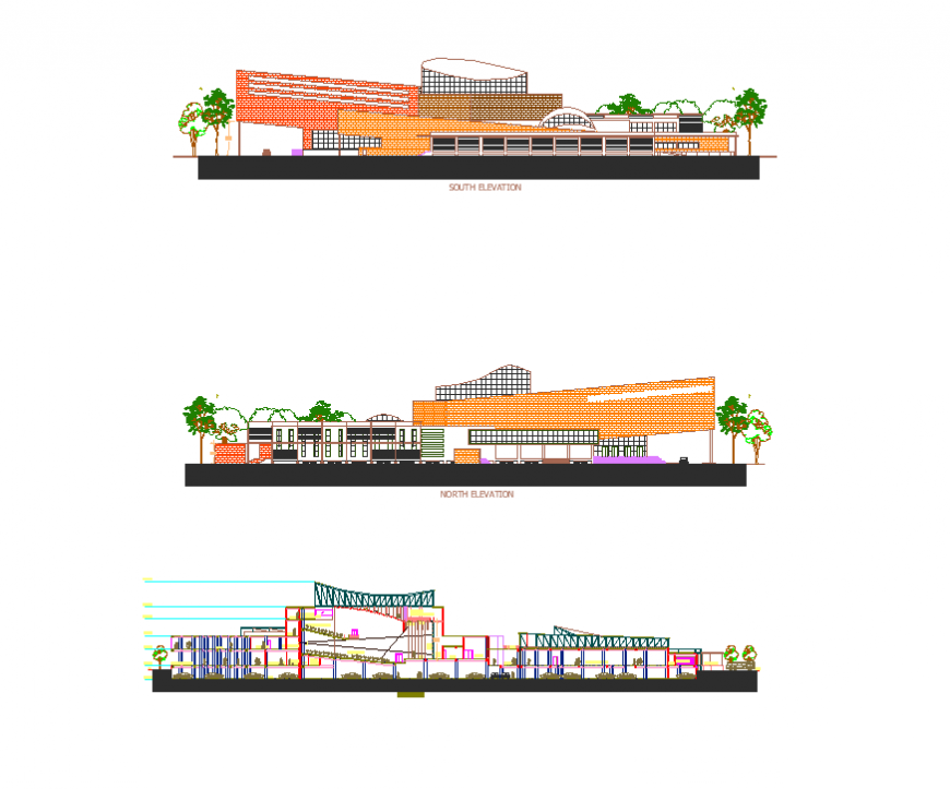 Convention center building elevation layout file, front elevation detail, brick wall detail, landscaping trees detail, hatching detail, coloring detail, vehicle detail, parking detail, dimension detail, ramp detail, staircase detail, column detail, steel frame detail, terrace detail, north elevation detail, floor detail, etc.