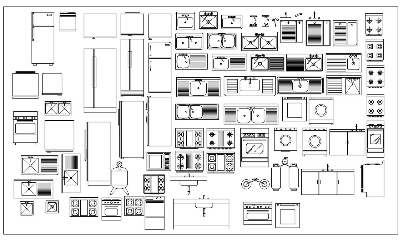Kitchen CAD Blocks; 2d cad drawing of kitchen CAD blocks includes refrigerator, sink, platform, Washing Machine, And Other Instrument. download Free sanitary CAD blocks.