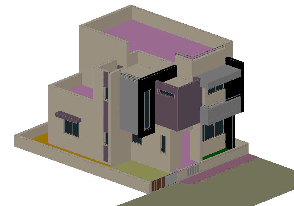 3d Modern House DWG File; download AutoCAD file of 3d house model with colour paint detail. download DWG house design with 3d view drawing.