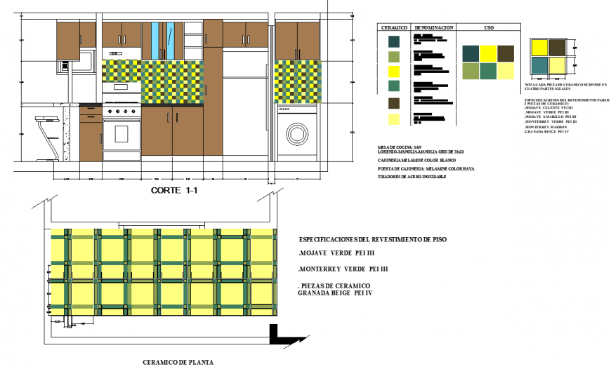 The kitchen plan detailing of dwg file. The top view kitchen plan with detailing of storage units, fridge, overhead storage units, etc., The elevation of furnitures with detailing of dimensions, storages, fridge, etc.,