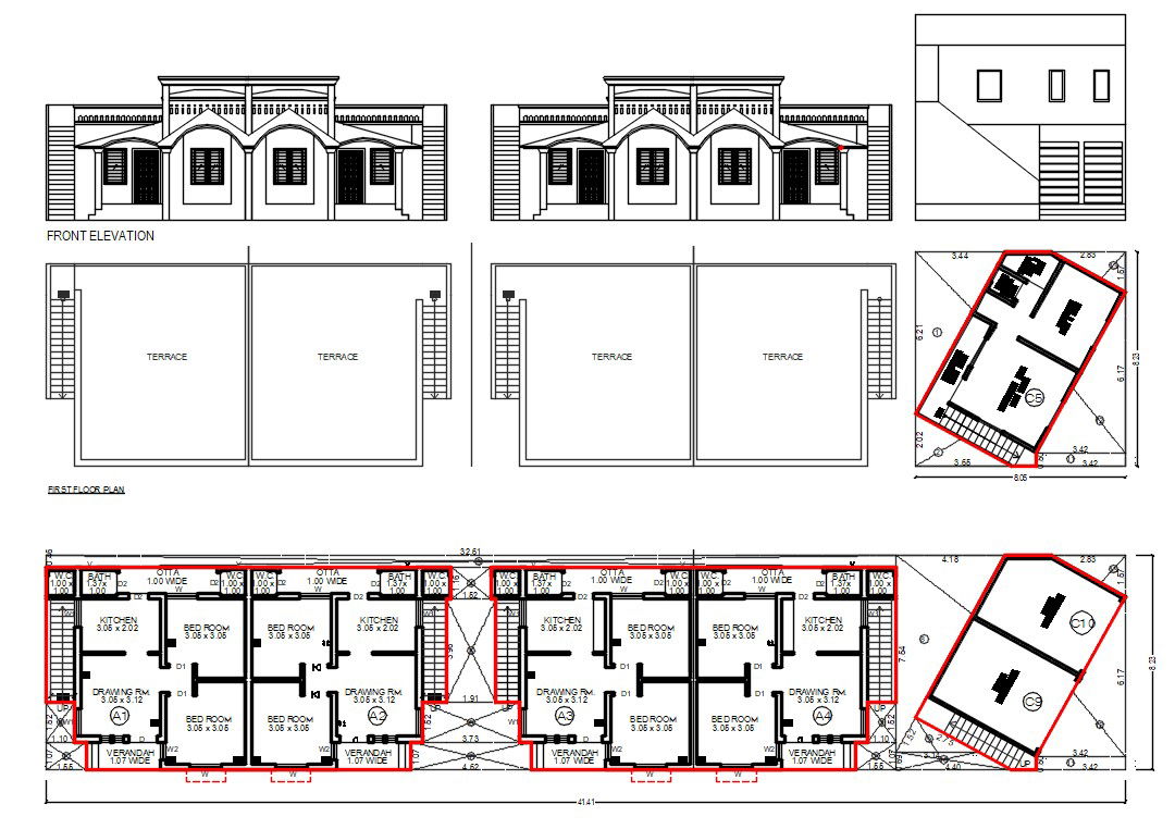 Duplex House Plan DWG File; 2 BHK duplex house plan CAD drawing includes front elevation design and ground floor plan with all measurement details. download AutoCAD file of the duplex house plan.