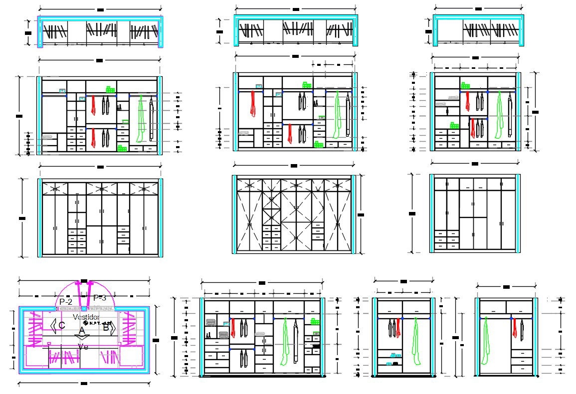 Wooden Closets DWG File; This Exterior Elevation and interior detail, and Open Wardrobe design section, and Dressing room detail.
