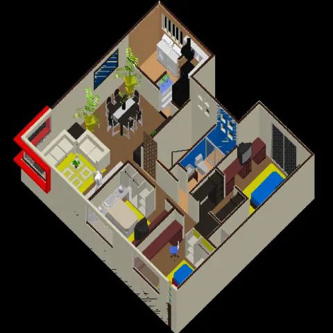 Get a detailed 3D DWG file of a house with top view and interior details. Ideal for architects, engineers, and CAD designers for precise home planning.