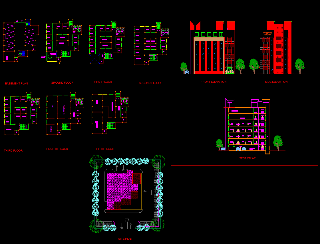 Explore a comprehensive set of corporate office working drawings in AutoCAD DWG format, tailored for architects, civil engineers, interior designers, and builders. This package features detailed floor plans for the basement, ground, first, second, third, fourth, and fifth floors. Clear sections and elevations are included, such as front elevation, side elevation, and a detailed sectional view. Every drawing displays precise measurements, room layouts, and circulation details, making it ideal for professional project planning and design implementation.