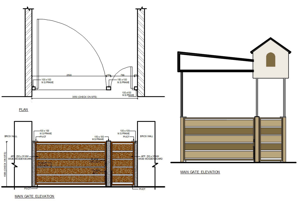Main Gate Elevation CAD Drawing; download free AutoCAD file of main gate elevation design and top view plan with dimension detail.