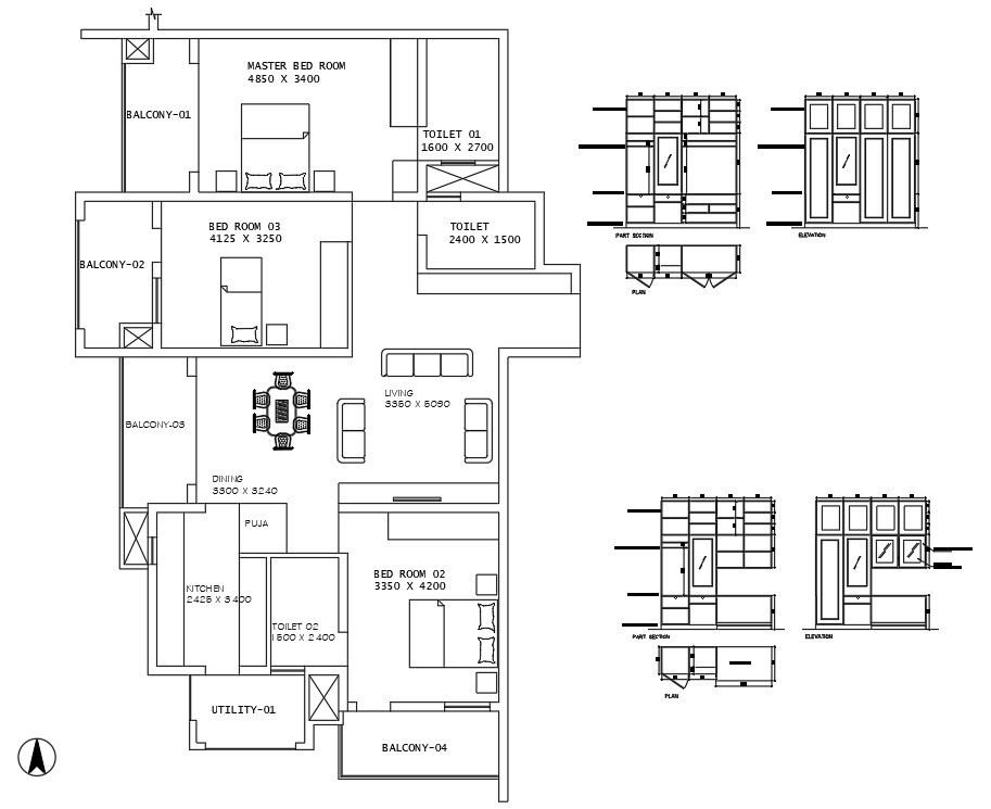 Family house details layout plan, furniture details in a wood broad , raised floor, study table , dower, kitchen, bedroom, dining room, living room.