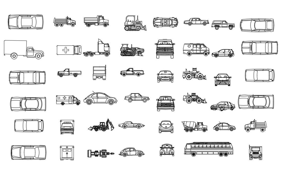 Vehicle Autocad Block detail in car top view, ambulance all side view, Tractor design, Bus, construction machine cvehicle etc block.