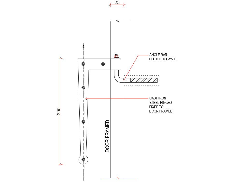 Door Frame Detail in a structure details cast iron steel hing fixed to door framed, angle bar bolted to wall. this file draw in auotcad format.