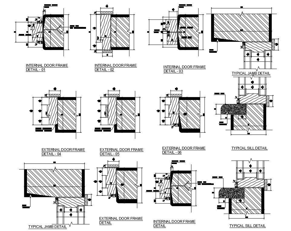 Door Frame Detail in a wooden details , section plan, foundation details , water proofing , slicone sealant, stine sill drip course, pencil round edge, steel screw.
