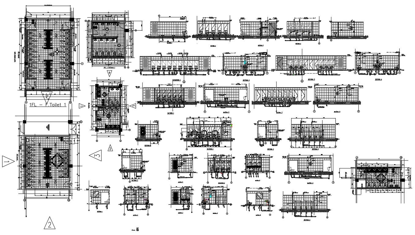 Toilet Detail in a layout plan, door details, section plan , wash basing , pipe details , glass, sanitary ware details ,
