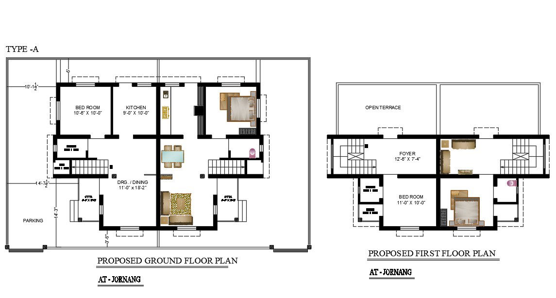 Family house layout details in a ground floor and first floor plan, kitchen, bedroom , living room, dining room,