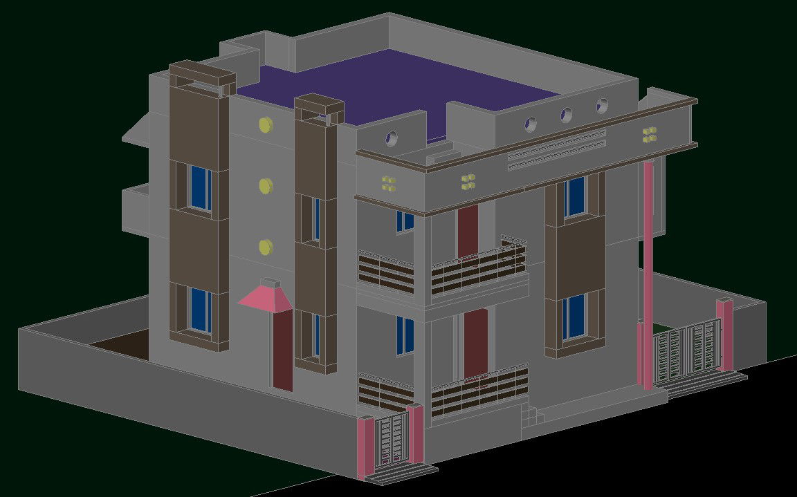 3d House details in a elevation details front view , right and left side elevation , balcony , door and window details , This file draw in autocd format.