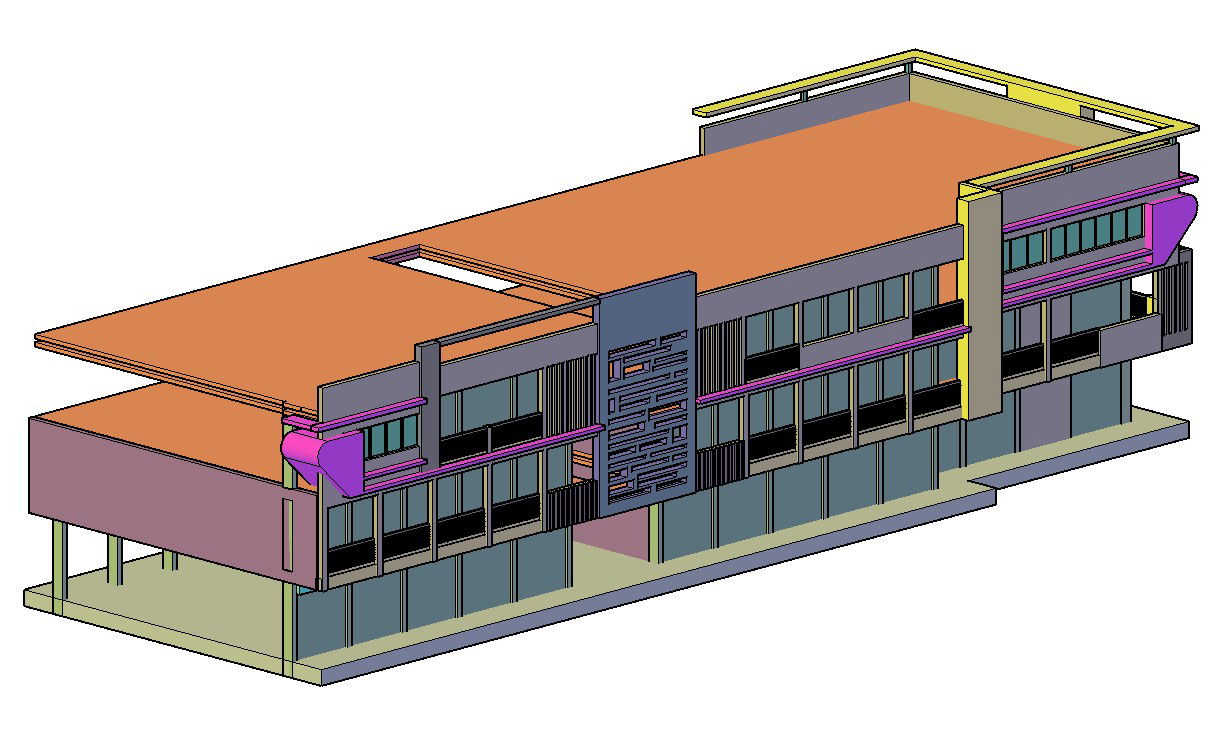 3D Shopping mall details including a front elevation design, right and left side elevation details , balcony , door and