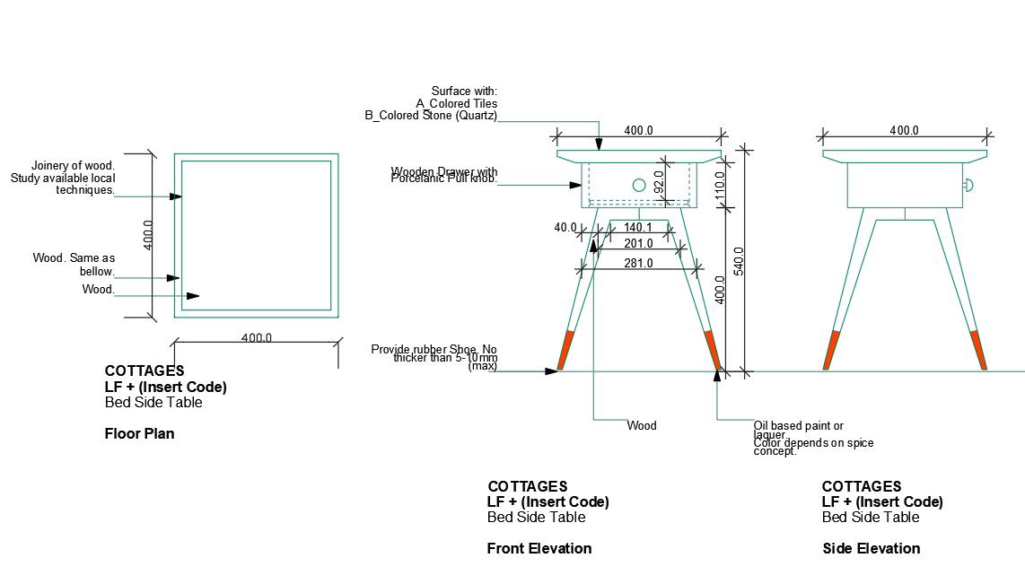 Table Structure details including a bed side table , front side elevation , Joinery of wood, Study available local techniques.