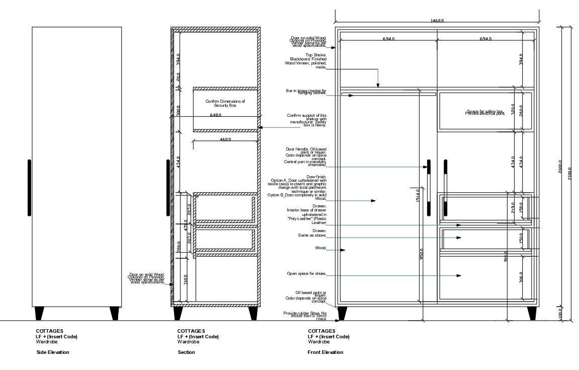 Wardrobe details provide in a front elevation , side elevation , section plan, Door Handle. Oil based paint or lacquer,