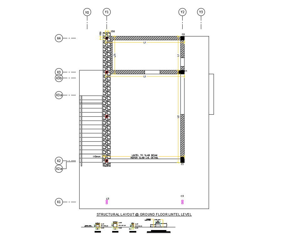 Beam details including a structural layout ground floor lintel , lintel to slab beam refer slab level details , this file draw in autocad format.