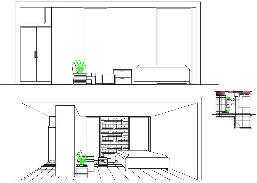 This Room furniture Perspective View Design draw in autocad file. and 2 floor Design.