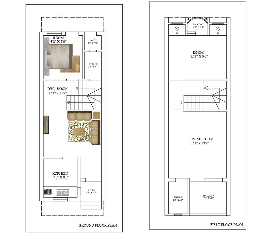 Layout home details in a kitchen , living room, bedroom, balcony , stair details , first floor plan, ground floor plan, furniture details, sofa set, double bed details.