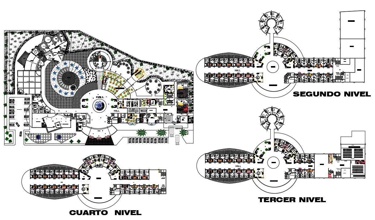 Modern Hotel Lay-out in restaurant, Garden, Bed room, Hall, and Luxury facility include this hotel. all floor design.