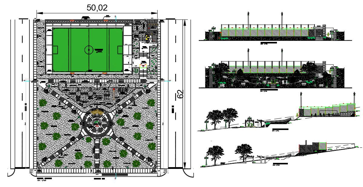 Layout plan and modern landscaping design of Public park. Garden With Sport Area Design Detail.
