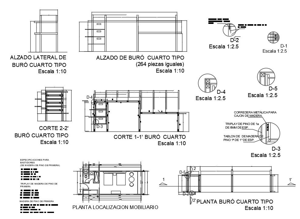 Furniture details including a elevation , side elevation , plant location furniture , fourth floor type bureau, sliding metallic wood details,