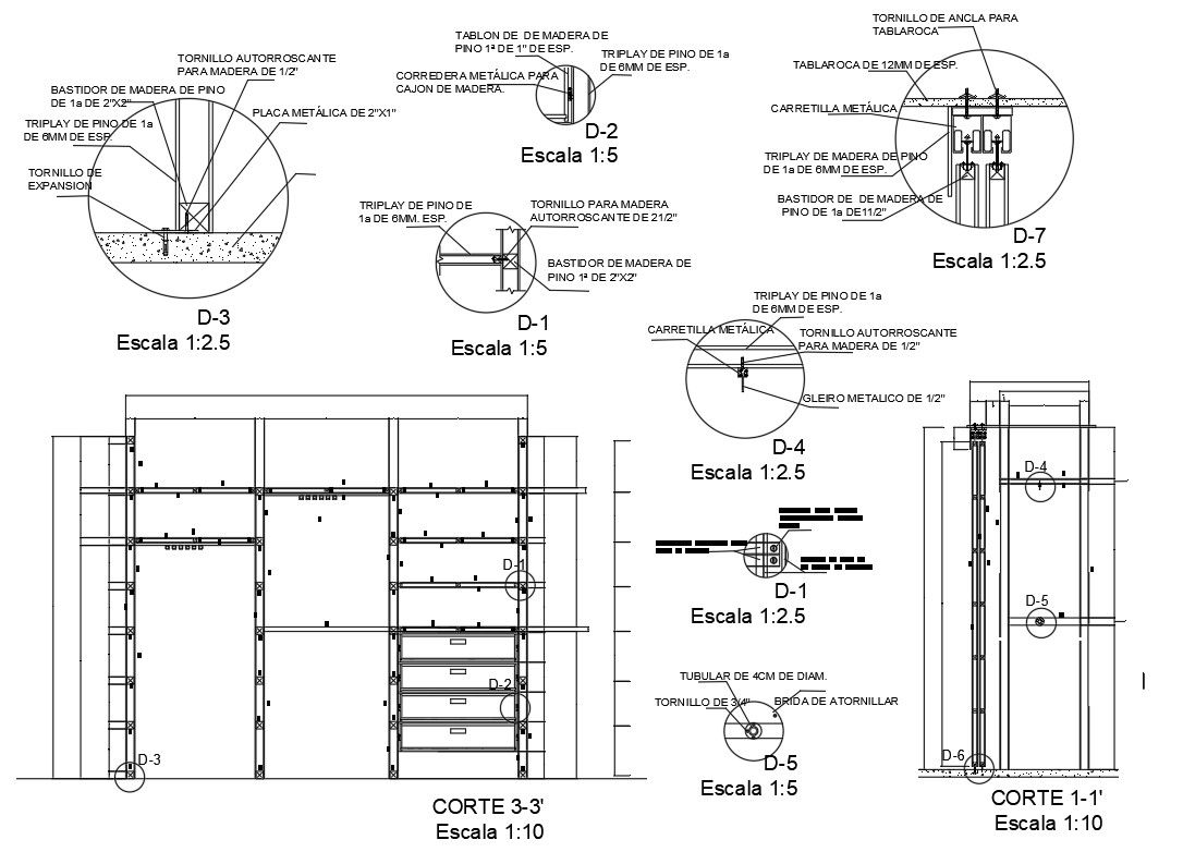 Wardrobe structure details including a section plan, screw expansion, screw anchor drywall, metallic fox, flange screw, wood screw self tapping flat details.