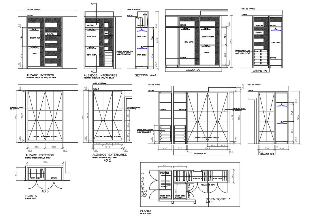 Wooden Wardrobe details in a trunk , short clothes , shelves , beech wood interior, line of forged , doors with hinges, drawer details.