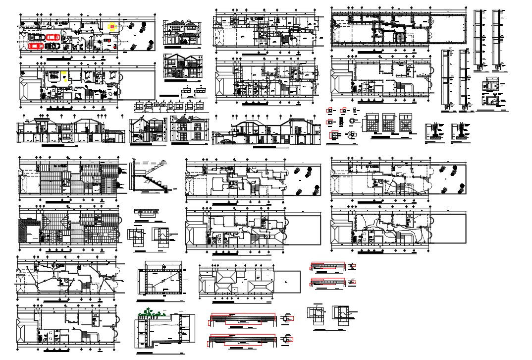 Residential House details including a layout details , elevation plan, structure details ,parking area, furniture